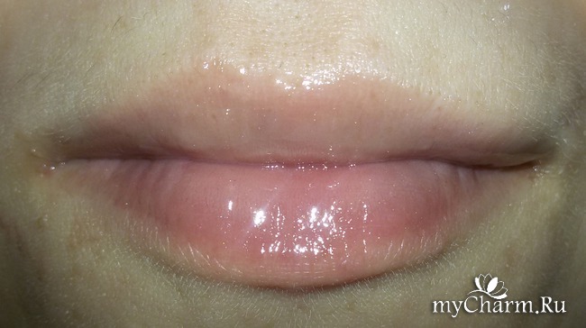 На поверхности губ блеск ведет себя вполне достойно. Светится и хорошо отражает лучики солнца. Губы с ним получаются объемнее и привлекательнее, несмотря на то, что оттенок практически нейтральный. Но в этом-то и весь фокус. Ведь губы смотрятся очень натурально, будто их слегка смочили водой.