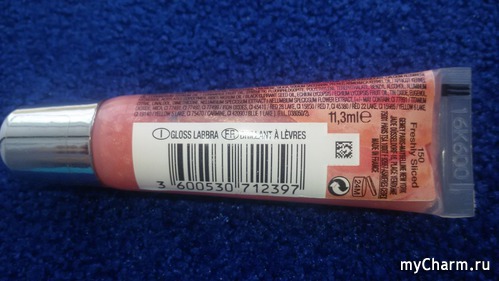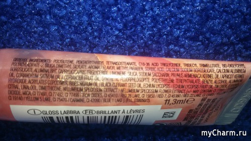 Перечень компонентов блеска я при покупке изучать не стала (слишком мелкий шрифт). Но дома все же решила быть более дотошной и с приятным удивлением выяснила, что в блеске содержится немало натуральных масел, в том числе абрикосовое, персиковое, кориандровое. Звучит многообещающе: значит, он может дарить моим губкам не только красоту, но и ухаживать за ними. Что ж, ставим плюсик.
