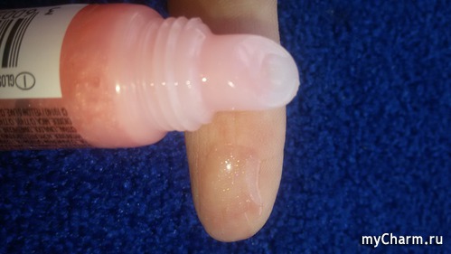 Мои опасения по поводу излишнего вытекания средства из отверстия в верхней части тюбика не оправдались. Благодаря своей гелеобразной густоте блеск выдавливается постепенно, а не выливается ручьем. Так что в процессе нанесения можно даже в зеркало не смотреться. Достаточно одной небольшой капельки, которую потом при помощи диагонально срезанного верхнего края можно равномерно нанести на губы. Он одинаково заполняет все микроскладочки и уголочки, ложась ровным, красивым слоем.