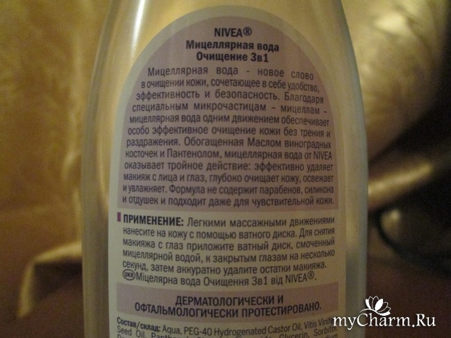 В данном случае понятие «3 в 1» означало, что эта вода включает в себя достоинства средства, очищающего лицо от излишнего жира, также средства для снятия макияжа, косметики и тонизирующего средства. То есть благодаря этой водичке не нужно было покупать два других дополнительных средства для очищения кожи. Компания Nivea заявила, что данная мицеллярная вода хорошо удаляет макияж, глубоко очищает кожу и одновременно увлажняет и тонизирует ее. К тому же эта вода подходит для всех типов кожи, даже для самой чувствительной.