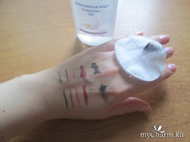 Стираю остатки нанесенной декоративной косметики ватным тампоном и вуаля – рука чистая! То же самое происходит и с лицом во время его очищения. Я не пробовала, но слышала, что даже зеленку мицеллярная вода очищает с успехом.