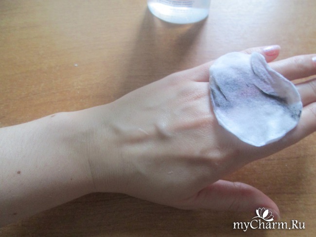 Наношу немного средства на ватный тампон и очищаю лицо и шею. В первую очередь, конечно, лицо. Снимаю макияж с глаз, губ и компактную пудру с лица. Затем новой порцией средства на свежем ватном тампоне освежаю очищенное от макияжа лицо. Протираю до тех пор, пока ватка не будет чистой.