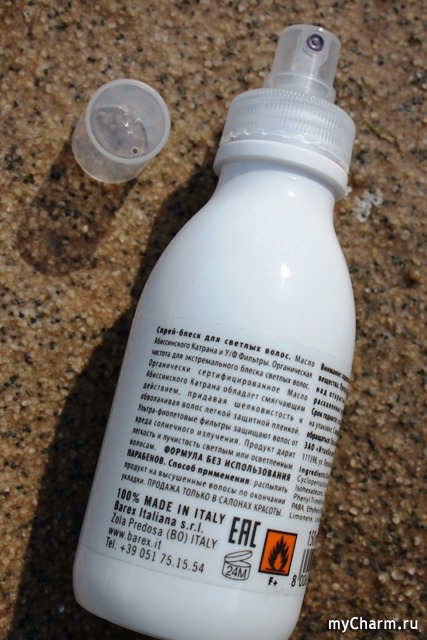 Если вы уже дождались лета или собираетесь в жаркие страны, то присмотритесь к этому полезному и простому в использовании продукту. Удобный пластиковый флакон имеет распылитель-дозатор. Всего несколько пшиков по все длине прически по окончании укладки и можно уверенно отправляться на пляж или блистать на гламурной вечеринке. Спрей-блеск станет завершающим штрихом вашего образа, который одновременно с уходовой составляющей добавит яркости и утонченности.
