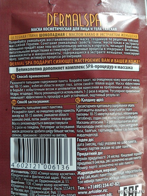 Так же я попробовала эту шоколадную маску в качестве обертывания. Нанесла на бедра и укутала пленкой, а сверху надела теплые штаны. Подержала, таким образом, 40 минут. Когда я сняла пленку, маска не сухая была. Смывать ее не просто, она как будто «вцепилась» в кожу и не хотела отходить. Но после удаления маски кожа такая гладкая и приятная на ощупь, одно удовольствие. Хочу заметить, кожа была увлажнена и не просила дополнительного увлажнения. Маску рекомендовано использовать 1-2 раза в неделю. Как раз я использовала два раза в неделю. Очень довольна результатом. У меня нет целлюлита, но для профилактики мне очень подходит такая маска Dermal Spa.