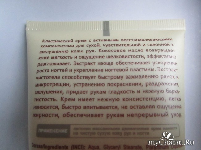 Так, из полезного растительного можно отметить кокосовое масло, которое обладает целым букетом необходимых для кожи свойств: питает, увлажняет, смягчает, образует тончайшую защитную пленочку на коже. Экстракт хвоща полевого работает над ноготками: дело в том, что это растение накапливает в себе кремниевую кислоту, которая необходима нашей эпителиальной ткани. Также производитель выделяет в описании крема экстракт чистотела, который борется с мелкими повреждениями кожи.