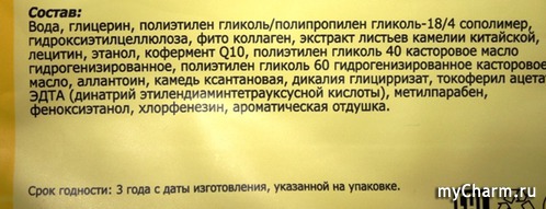 Что касается состава, то в самом конце списка плетется один парабенчик. Растительный ряд представляют фито коллаген и экстракт листьев камелии китайской. Также здесь есть и прекрасный компонент – кофермент Q10. Иначе его называют коэензим Q10. Это сильный антиоксидант, который присутствует в клетках нашей. Когда мы приближаемся к границе тридцатилетнего возраста, то количество этого чудесного элемента сильно сокращается. В итоге появляются бледность и серый оттенок лица, гусиные лапки и даже сухость. Средства, содержащие Q10 помогают коже бороться со свободными радикалами и возвращать тонус и упругость. А еще Q10 помогает гиалуроновой кислоте задерживаться в тканях. А значит, кожа будет более увлажненная.