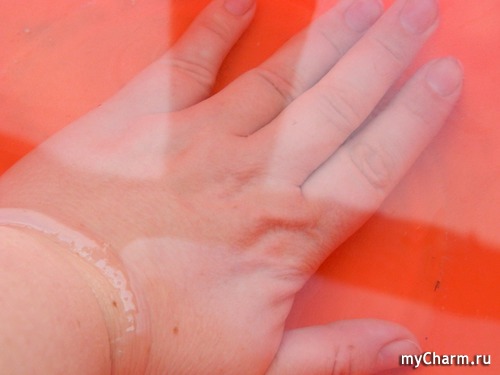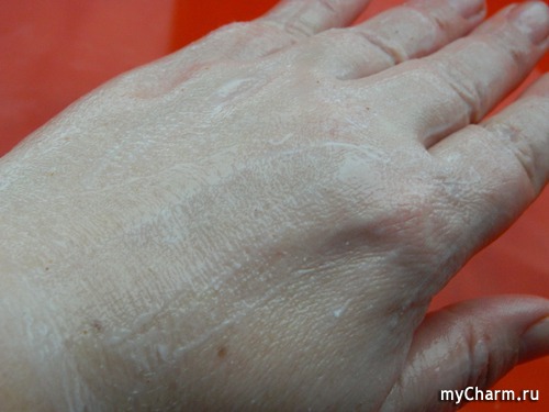 Помассировав руки небольшое количество времени, смываю средство тёплой водой. На коже остаётся как бы жирная плёночка – настолько скраб был жирным. Сначала мне хотелось её смыть с помощью мыла, но потом я решила, что это лишняя защита для кожи и не стала.