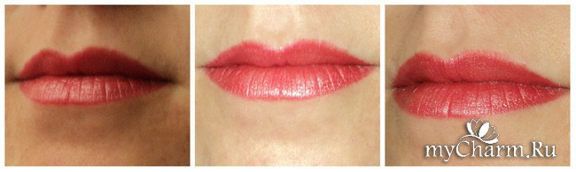 Что обещает нам производитель? Во-первых, мягкую текстуру без блесток (это то, что мне нужно!); во-вторых, насыщенный цвет в одно покрытие; в-третьих, увлажнение и стойкость. Заманчиво, не правда ли? И надо сказать, что производитель нас не обманул. Помада имеет легкую кремовую текстуру, при нанесении она легко скользит по губам, оставляя за собой четкую границу по контуру. Поэтому помаду можно использовать без контурного карандаша, что можно назвать дополнительным плюсом. Все другие помады, которые имеются в моем арсенале, я применяю только с карандашом.