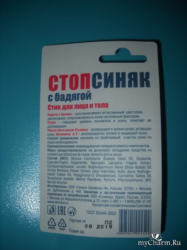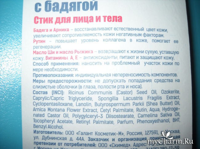 А на обратной стороне упаковки можно получить еще более подробную информацию о приобретенном продукте. Изготовителем данного стика является расположенное в Москве ООО «Галант Косметик-М», а заказчиком – ООО «Скимед». Стик именуется косметической продукцией, а срок его годности истекает в августе 2019 года, то есть служить он еще будет долго! Здесь же имеется подробная информация о составе средства и о входящих в него активных компонентах, а также инструкция по его применению, противопоказания и меры предосторожности. Впрочем, противопоказание к использованию подобного средства всего одно-единственное – индивидуальная непереносимость входящих в его состав компонентов. Что касается мер предосторожности, то во время использования стика крайне важно постараться не допустить попадание средства на любые слизистые оболочки (в полости носа, рта или в глаза).