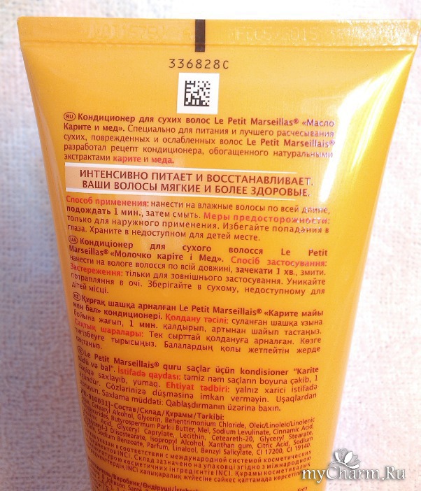 С обратной стороны написано о том, что кондиционер имеет формулу, в состав которой входит молочко карите, которое известно своими увлажняющими свойствами и мед, который способствует насыщению волос питательными веществами, восстанавливает структуру волос.