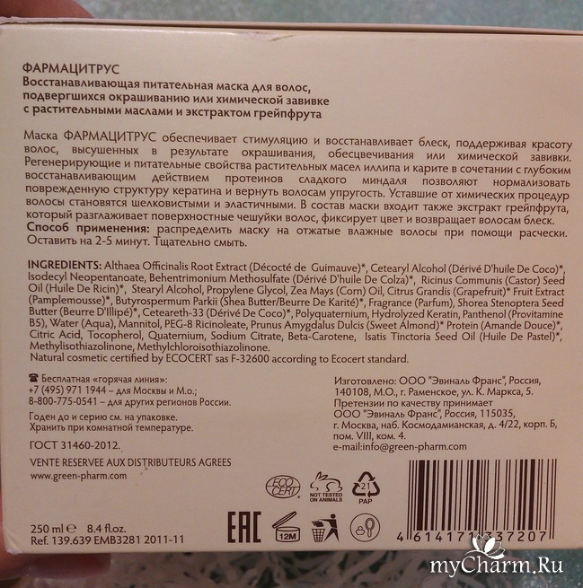 Благодаря наличию в составе растительных экстрактов и комплексному уходу за волосами вместе с шампунем этого же бренда, мои волосы выглядят великолепно. Я уверена, что вы будете очарованы действием косметики Green Pharma, и станете ее поклонником.