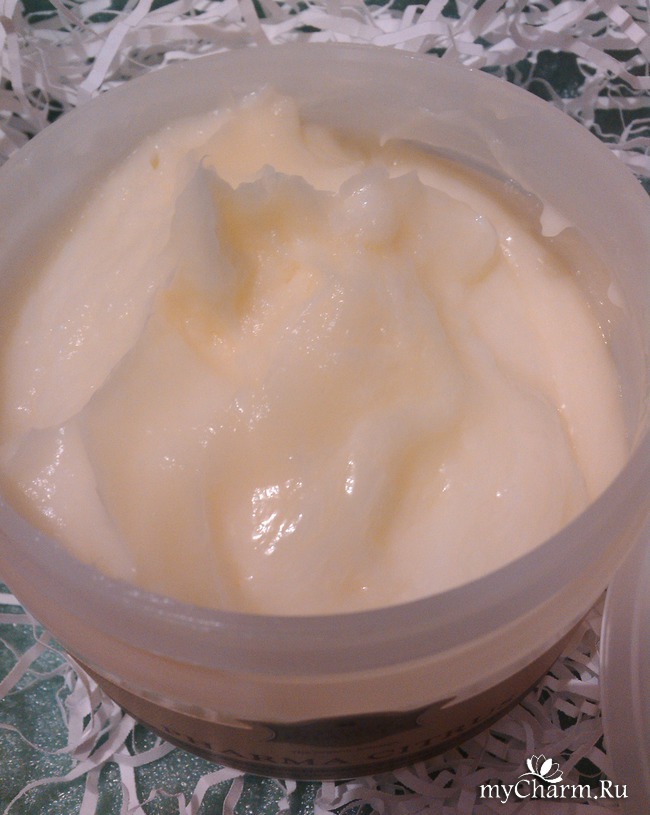 Маска густая. Консистенция, как у взбитого косметического масла. Аромат нежный и легкий, с нотками цитруса. Цвет маски приятный, желтоватый. На волосах распределяется легко, обволакивает каждый волосок, впитывается в волосы.