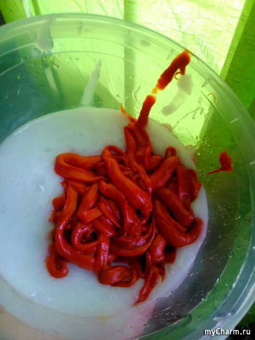 Смешиваем все в неметаллической мисочке. Цвет у окрашивающего крема оранжевый, какой и должен получиться на волосах.