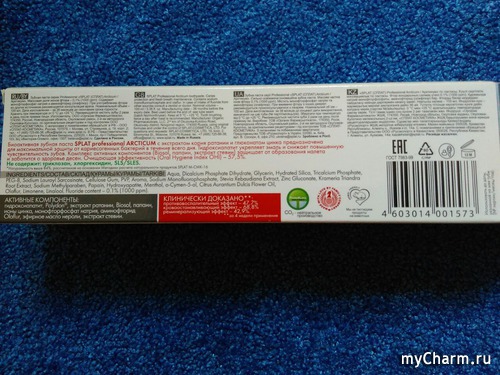 Все особенности данного продукта приведены с боковой стороны. Меня особенно порадовал компонент «эфирное масло дикого апельсина», уж очень люблю апельсины. Зубная паста «Арктикум» - биоактивная. Это значит, что отбеливание эмали, защита от кариеса и налета происходит за счет натуральных компонентов, свойства которых здесь и приведены.