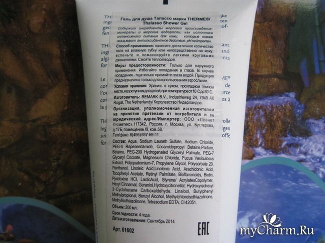 На тюбике геля для душа Therme Thalasso (200 мл) мы видим красивейшие морские водоросли, что создает морское настроение, заставляет вспомнить о беззаботных деньках, проведенных на берегу Красного, Средиземного или Черного моря.