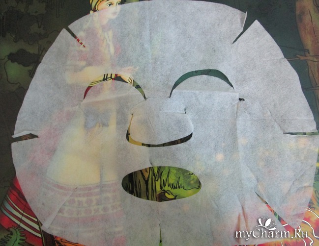 Маска, напоминающая мне своей формой и выражением лица привидений из детского фильма "Унесенные призраками" (когда смотрю на фото развернутой маски, на лице всегда появляется улыбка), пропитана средством щедро, от души.