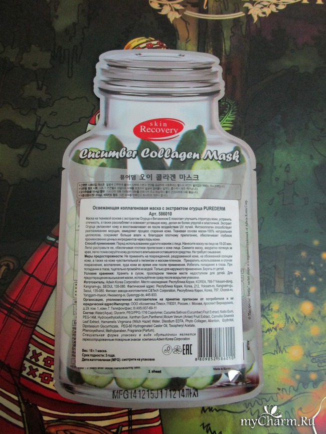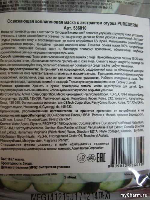Основным действующим компонентом этой маски, как видно из ее названия, является огурец — один из лучших освежителей и восстановителей кожи после УФ-лучей в летнюю пору. Приятно было обнаружить в составе не только экстракт огурца в начале, но и экстракты аниса, камелии, воду гамамелиса, стоящие в центре всех ингредиентов, аллантоин, пантенол, глицерин, касторовое масло, а также обещанный в описании фито-коллаген. Не обошлось, правда, и без метилпарабена, но ведь мы уже знаем (спасибо статьям майчармелек), что его вред не доказан, поэтому этот пункт к минусам нельзя отнести.