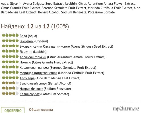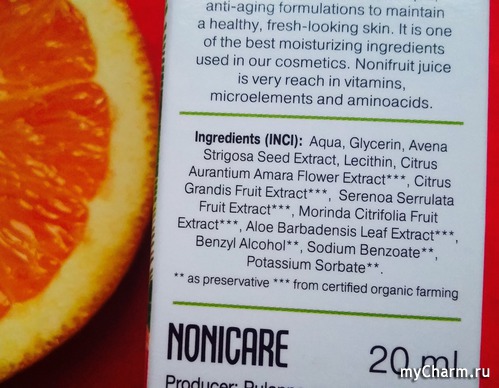 Каждый из них имеет большую ценность для кожи. Сок нони, которым славится косметика данного бренда, является мощным антиоксидантом и содержит большое количество витаминов и микроэлементов, проникающих в глубокие слои кожи. Алоэ вера увлажняет, успокаивает и расслабляет кожу. Экстракт грейпфрута, содержащий органические кислоты, способствует выравниванию цвета лица. Этот компонент также способен регулировать работу сальных желёз. Экстракт семян овса призван питать, укреплять и интенсивно увлажнять уставшую кожу. Экстракт апельсина способствует лучшей регенерации клеток, защищает от неблагоприятных внешних воздействий.