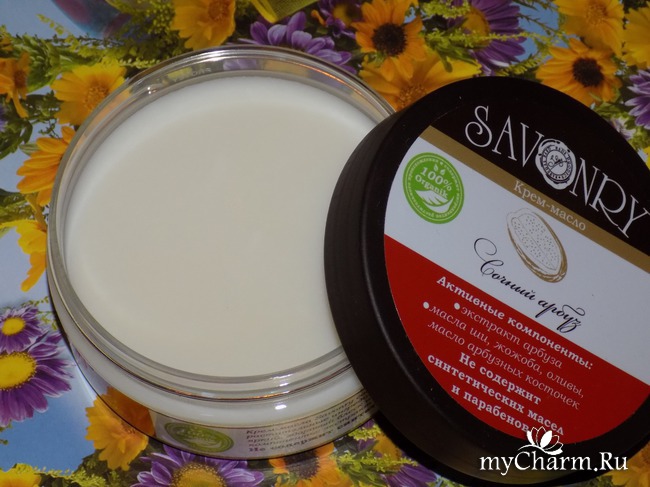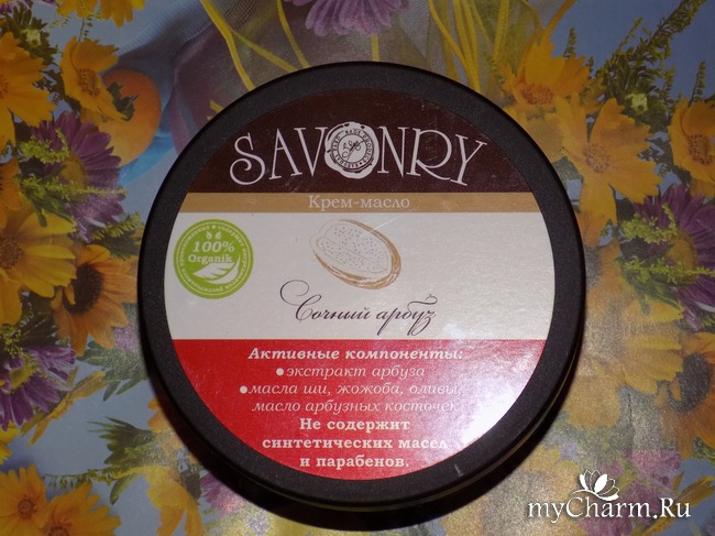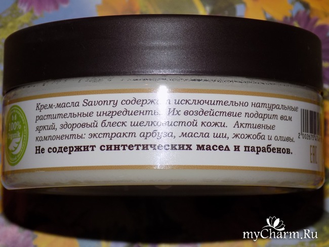 Масло заключено в круглую коробку (130 гр веса средства стоимостью 290 рублей в официальном интернет-магазине бренда - savonryshop.ru/tovar/cream_butter_watermelon.htm). При открывании поражает его удивительно глянцевая, гладкая поверхность. Даже не хочется нарушать этот глянец. Средство относится к твердым маслам. Провела пальцем по поверхности – она осталось неизменной, плотной, твердой. Чтобы взять порцию масла из баночки нужны даже некоторые усилия. Я, конечно, утрирую. Просто пытаюсь объяснить, что оно не кремообразное, палец в него так просто не погрузишь. Оно вроде крепко замороженного сливочного масла, которое при прикосновении к теплому телу начинает подтаивать.