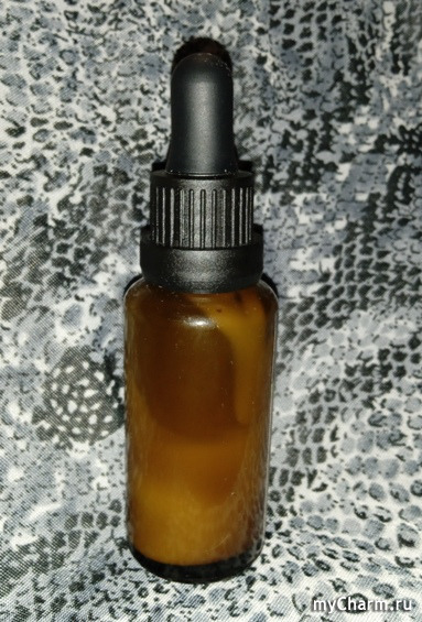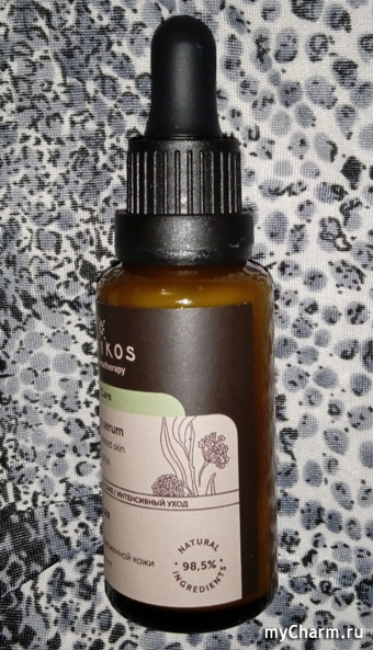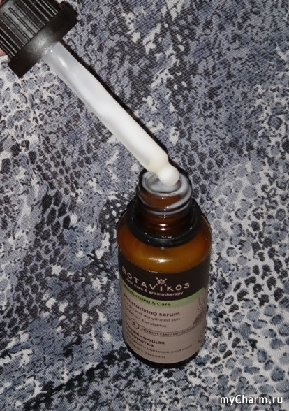 Aqua (вода), Centaurea Cyanus Flower Water (цветочная вода василька), Caprylic/Capric Triglyceride (каприлик/каприк триглицериды), Betaine (бетаин), Glycerin (глицерин), Polyglyceryl-6 Stearate (полиглицерил стеарат), Saccharide Isomerate (ферментированный гидролизат полисахаридов), Glyceryl Stearate (глицерил стеарат), Cetearyl Alcohol (цетеариловый спирт), Tocopheryl Acetate (витамин Е), Polyglyceryl-6 Behenate (полиглицерил бегенат), Camellia Oleifera Seed Oil (масло камелии), Cocos Nucifera Seed Butter (масло кокоса), Mangifera Indica Seed Butter (масло манго), Rosa Canina Fruit Extract (экстракт шиповника), Xantan Gum (ксантановая камедь), Citrus Limon Seed Oil (эфирное масло лимона), Ferula Galbaniflua Resin Oil (эфирное масло гальбанум), Citrus Sinensis Peel Oil (эфирное масло апельсина), Canarium Commune (Elemi) Gum Oil (эфирное масло элеми), Verbena Officinalis Oil (эфирное масло вербены), Eucalyptus Globulus Leaf Oil (эфирное масло эвкалипта), Litsea Cubeba Fruit Oil (эфирное масло литсея кубеба), Benzyl Alcohol (бензиловый спирт), Sodium Benzoate (бензоат натрия), Potassium Sorbate (сорбат калия), Linoleic Acid, Linolenic Acid (витамин F), Citric Acid (лимонная кислота), Tetrasodium Glutamate Diacetate (диацетат глутамат тетранатрия), Citronellol*, Limonene*.Выглядит многообещающе, правда? Сыворотка густая, молочно-белого цвета. Запах у неё не очень приятный, скорее медицинский. Мне на вид и на запах напомнило средство для желудка, называется Алмагель А :D