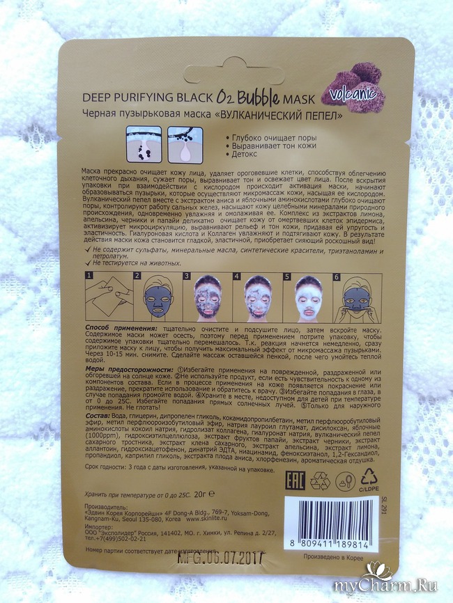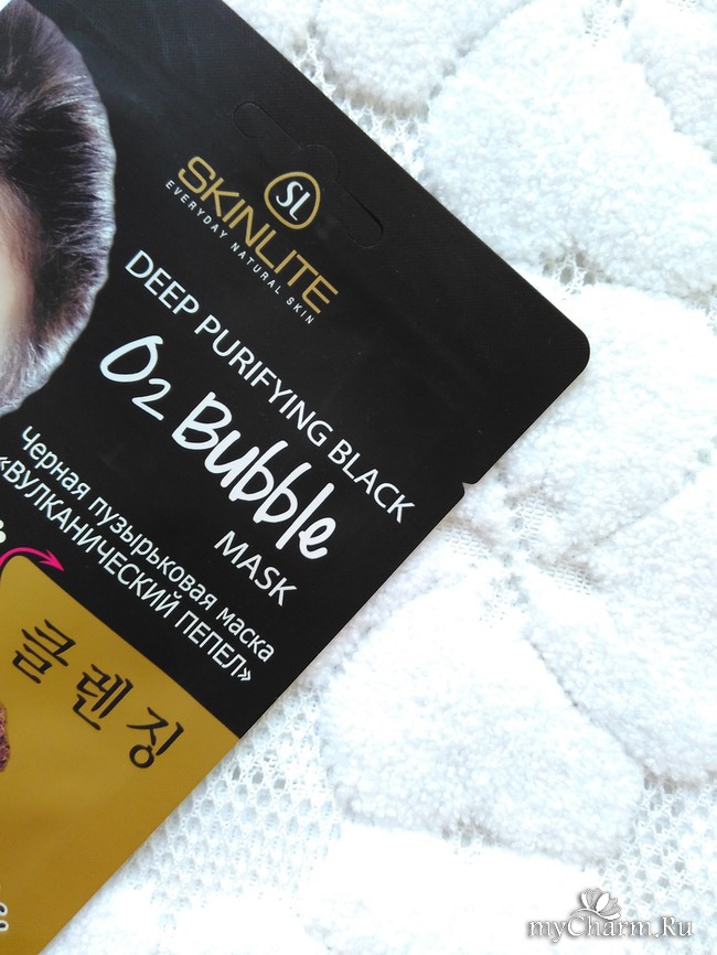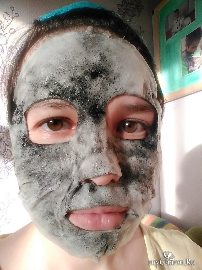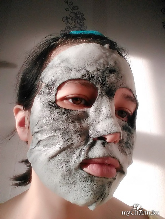 Если при вскрытии кажется, что маска – обычная тканевая, только черного цвета, то через несколько секунд она уже покрывается пузырями. Поэтому я незамедлительно приступила к применению.