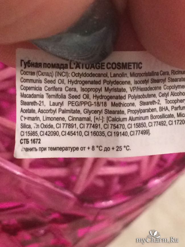На обратной стороне имеется этикетка. Как и во всей декоративной косметике данного производства, помимо парабенов и консервантов, есть положительные ингредиенты, которые играют свою важную роль. Из тех, что я поняла, имеется касторовое масло. Как известно, оно прекрасным образом смягчает кожу губ, не дает появляться микротрещинам, помогает при "обветривании", устраняет сухость. Масло семян макадамии образует воздухопроницаемую пленку, которая с одной стороны не дает негативным внешним факторам оказывать свои вредные воздействия на кожу губ, но в тоже время, в клетки (эпидермис) проникает воздух, что не дает возникновению сухости. Также масло макадамии обладает регенерирующими свойствами и делать кожу губ эластичней и привлекательней. Вот столько полезных свойств всего лишь в двух ингредиентах. Может есть и еще какие-то. Из-за мелкого шрифта я рассмотрела только это.