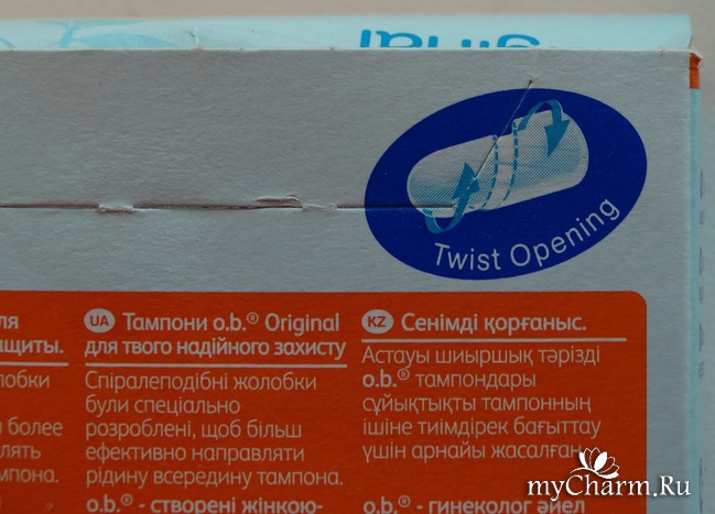 Открыв коробочку, мы видим два составляющих её: тампоны и инструкция по их применению на разных языках, в том числе и на русском.