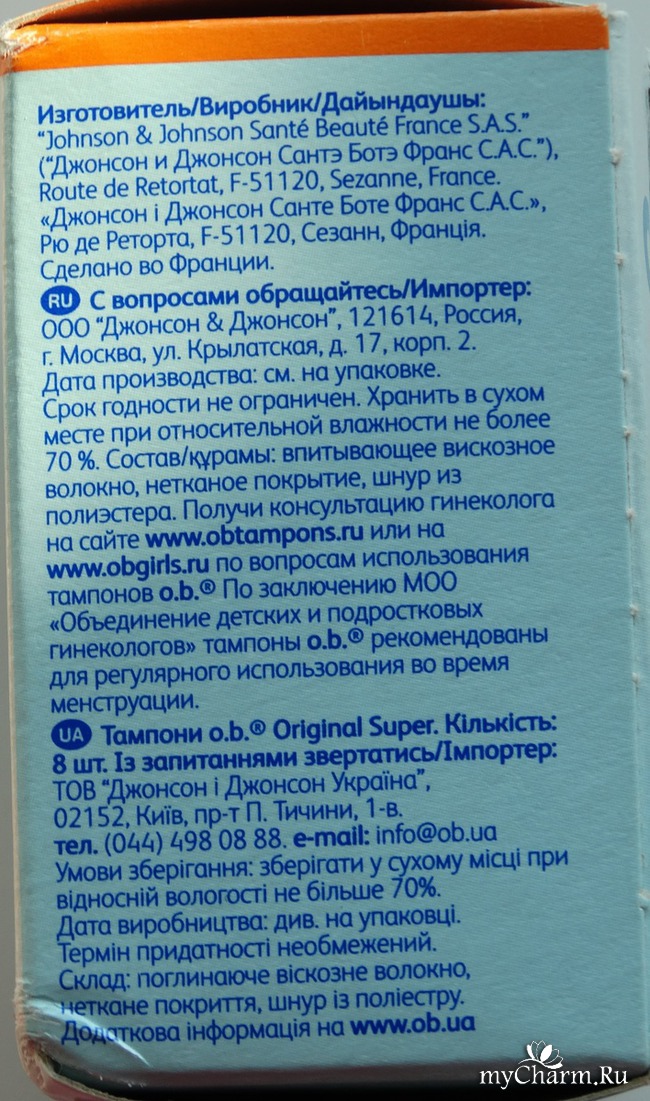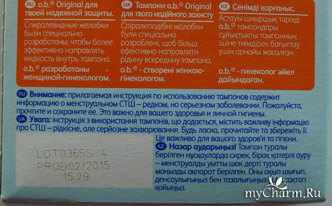 Там же - вновь обозначена фирма товара - O.B., небольшая его "рекламка" и важное предупреждение о том, что прилагаемая инструкция по использованию тампонов содержит информацию о менструальном СТШ - редком, но серьёзном заболевании.