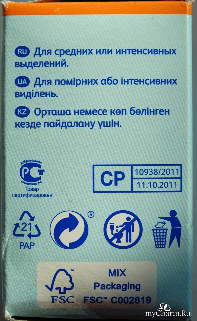 Если повертеть коробочку, то можно увидеть, что с одного бока имеются картинки, демонстрирующие, как можно и как нельзя утилизировать данное средство, а выше - пометка, что эти тампоны предназначены для средних или интенсивных выделений.