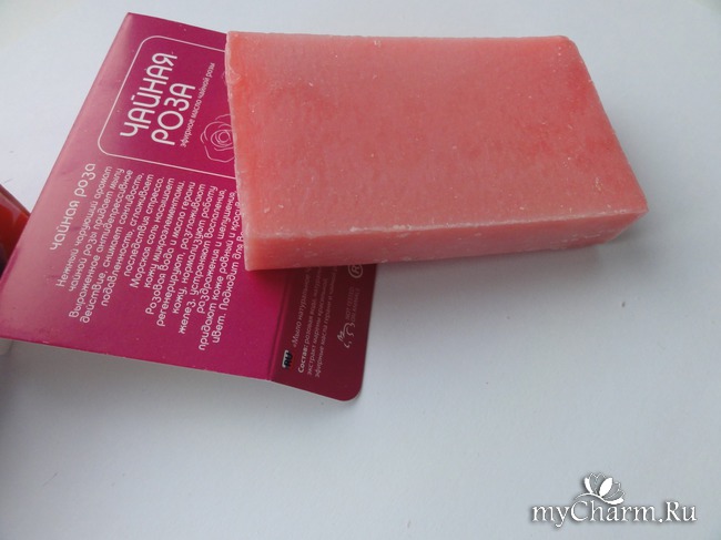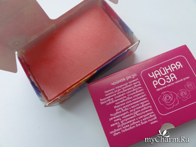 Натуральный краситель придает мылу нежный розовый цвет. Как подобает обычному мылу, не глицериновому, оно довольно твердое. Аромат мыла, которым еще не пользовались, совсем тонкий, нежный, едва уловимый. Но после размыливания аромат усиливается, пена мыла «Чайная роза» благоухает довольно ощутимо, и это действительно запах розы. Эфирное масло герани обычно имеет своеобразный аромат, его узнают все, кто когда-либо нюхал цветок и листья герани, он своеобразный, немного удушливый. Но в мыле аромат герани почти совсем не ощущается, сочетаясь с розой, получается великолепный цветочный букет, где роза все-таки преобладает.