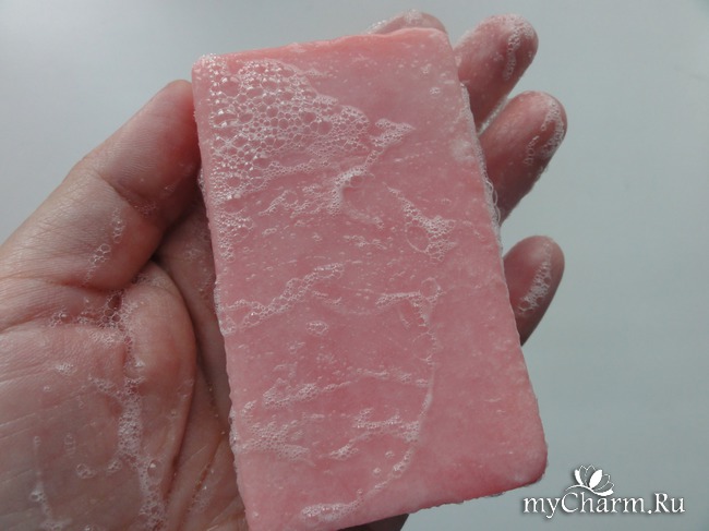Мыло образует крепкую обильную пену, хорошо мылится как в горячей, теплой, так и в холодной воде. Отлично очищает руки и тело, придавая коже нежный розовый аромат. Масла ухаживают за кожей, как известно, кокосовое и оливковое масла замечательно питают, смягчают кожу, пальмовое масло почти всегда в косметических средствах с этими маслами используют для качественного очищения. Рициновое масло - для меня незнакомое, на проверку оказалось всем известным касторовым, которое обладает омолаживающим, смягчающим действием и антибактериальным эффектом.