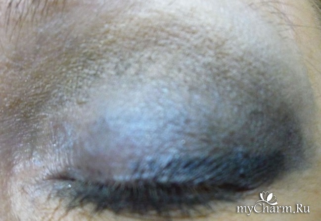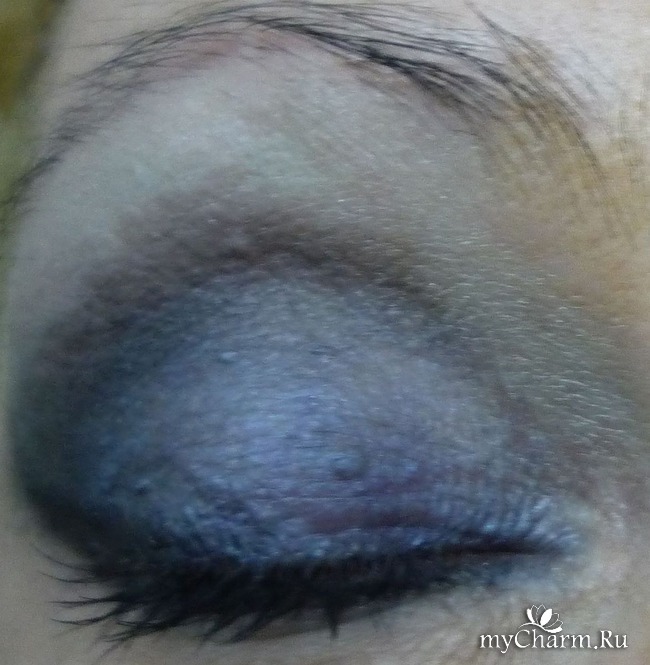Как вариант для вечернего макияжа с соответствующей одеждой можно попробовать совместить "Джинсовый блюз" на нижнем веке и "Чёрный бархат" на внешних углах нижнего века и в складке века с растушёвкой и нанесением под бровями любых светлых теней. Ну вот что-то типа такого получилось.
