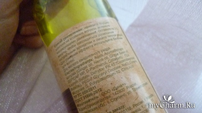 Основные компоненты состава: имбирь, стимулирующий рост волос, масло виноградной косточки, насыщающее кожу и волосы питательными веществами, эфирное масло нероли, отличающееся способностью к регенерации волос и кожи головы. Если взглянуть на этикетку и более подробно изучить состав, быстро становится ясно, что за столь скромные деньги он уникален.