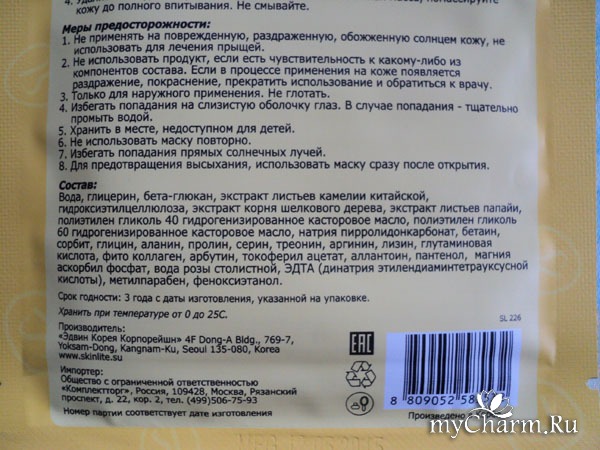 Эта маска реально имеет активные компоненты, потому что ощущается не просто влажный лист ткани на лице – чувствуется небольшое покалывание в первую минуту.