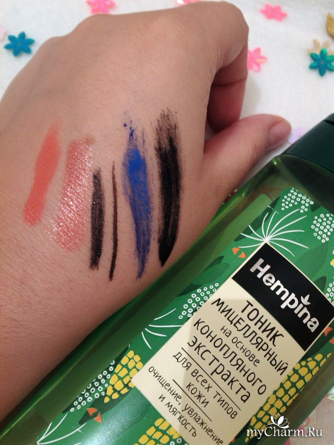 На тыльную сторону ладони я нанесла два мазка двух разных помад, след от карандаша для глаз, след от фломастера для рисования стрелок, след от двух тушей для ресниц (синего и черного цвета). Это основная косметика, которой я пользуюсь ежедневно.