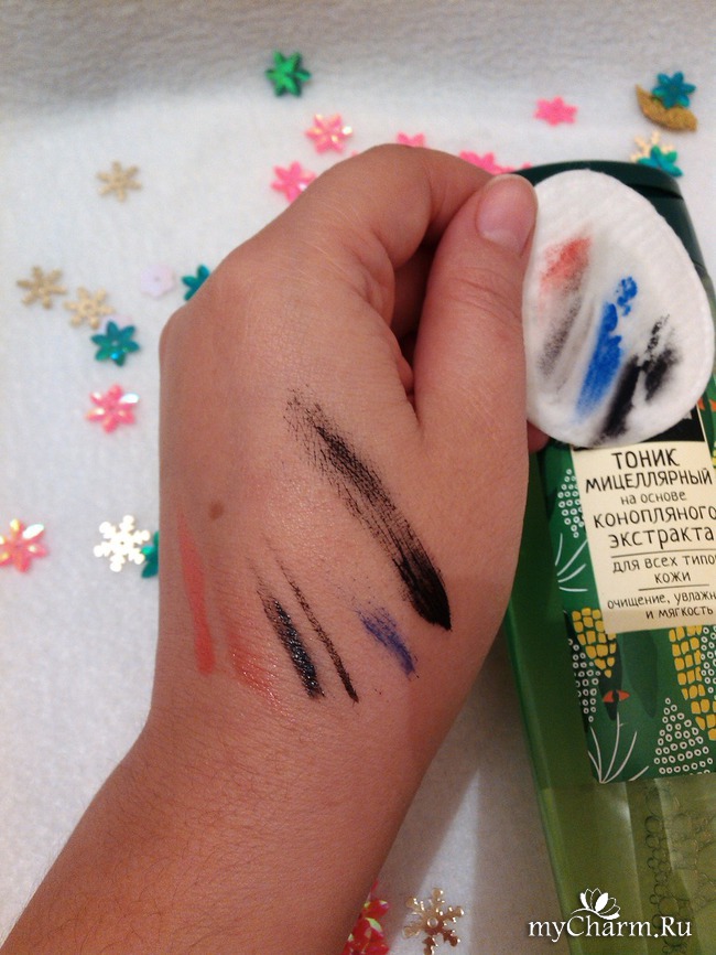 Затем я намочила ватный диск мицеллярным тоником "Hempina" и провела по своим "художествам".