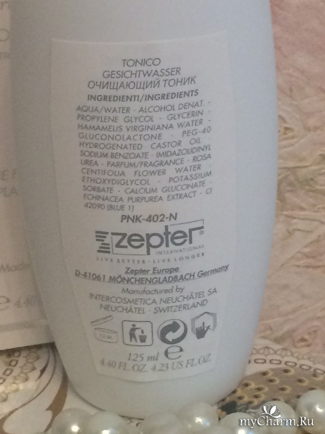 Итак, очищающий тоник заключен в картонную красивую, дорогую на вид, коробочку. С некоторых сторон имеется информация о средстве, правда все на иностранном языке. Но, ничего страшного. Внутри коробочки находится привлекательный белый флакончик с тоником, а также буклетик. Флакон с очищающим средством имеет винтовую белую крышку, на которой еще имеется прозрачный колпачок. Откручивая крышку, видим дозатор с небольшим удобным горлышком. Для меня он вполне удобный.