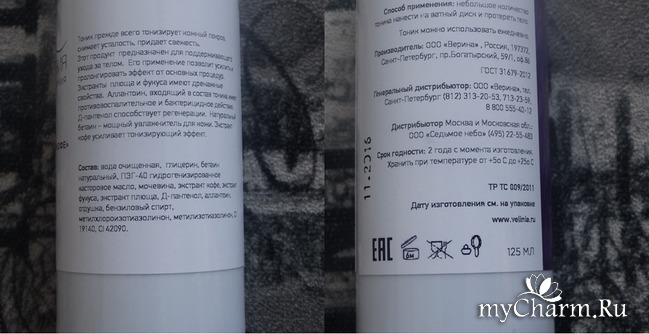 О молочке для тела я уже рассказывала здесь https://www.mycharm.ru/kosmetika/obzory/molochko-dlya-tela-zabota-o-kozhe/, а теперь настала очередь Тоника "Зеленый кофе" для тела от "Велиния".