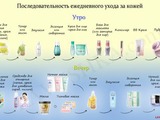 Взгляните хотя б на эту табличку, на которой можно увидеть, что даже такой простейший, казалось бы, этап, как тонизирование, состоит из целых трех средств – тоника, эмульсии и эссенции.