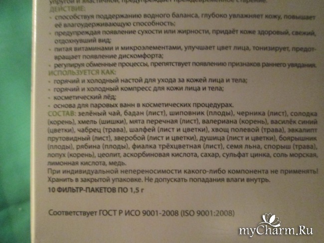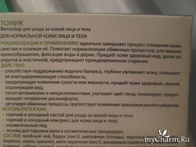 Инструкция внутри коробочки предлагает заваривать 1-2 пакетика-саше 100 или 200 мл крутого кипятка, затем раствор нужно настоять под крышечкой минут 15 и можно использовать по назначению. Перечислять не буду способы применения тоника, предлагаемые производителем косметики. Их очень много! Думаю, каждый выберет себе по вкусу тот метод ухода за кожей лица и шеи, к которому он больше привык.