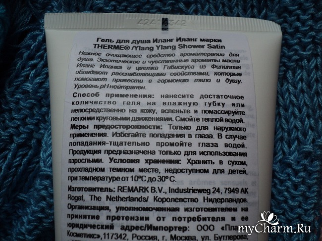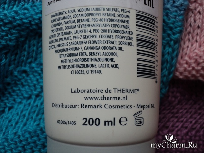Итак, приступим к описанию. Гель для душа Иланг-Иланг, как и другие аналогичные продукты Therme, заключен в мягкую тубу объемом 200 мл. Туба, в свою очередь, оснащена достаточно прочной крышкой, отрывающейся и закрывающейся характерным щелчком. Срок годности геля после вскрытия составляет 12 месяцев, об этом говорит значок отрытой баночки, расположенный на обратной стороне флакона. Срок реализации равен 4 годам, довольно большой период, на мой взгляд. Вся интересующая информация нанесена на бумажную этикетку. Приятно, что производитель заботится о русскоязычном населении.