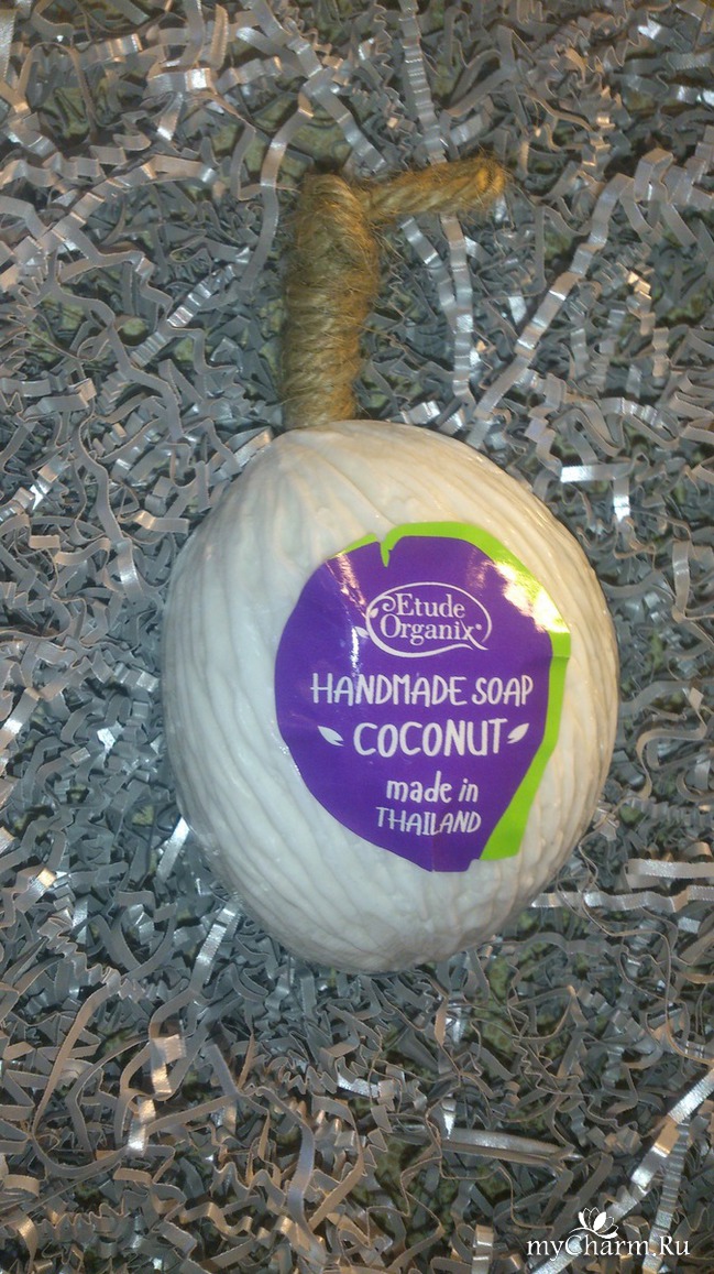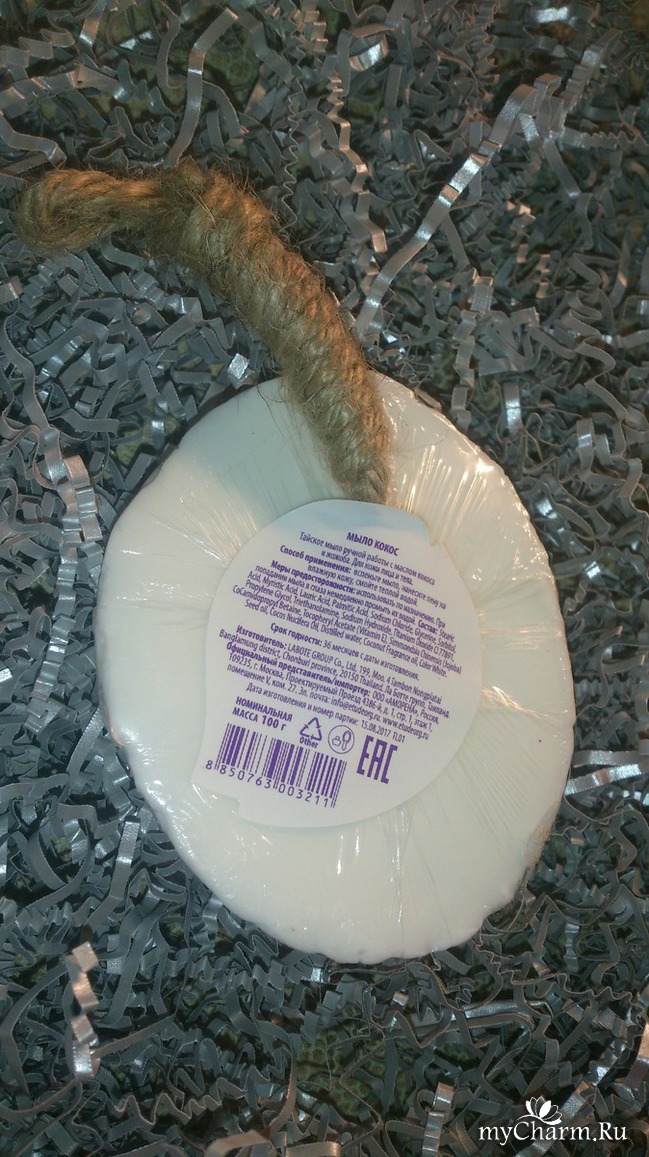 Выглядит оно в форме половинки ореха -плода кокосовой пальмы. Сбоку имеется джутовая веревочка-петелька, за которую можно вешать мыльце. Новый кусочек был в прозрачной герметичной пленке, которая легко снимается.