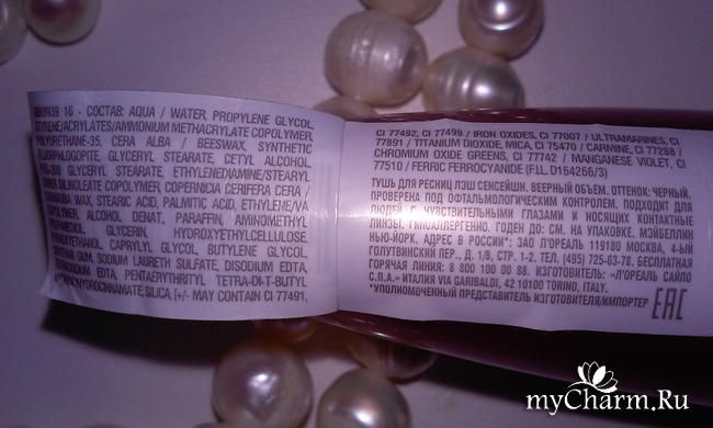 Здесь указан состав продукта, а также информация для людей с чувствительными глазами, о том что тушь проверена под офтальмологическим контролем, гипоаллергенна и подходит для людей, носящих контактные линзы, как раз для меня! Могу сразу сказать, что тушь действительно не дает аллергической реакции, глазам абсолютно комфортно в течение всего времени "ношения" туши.