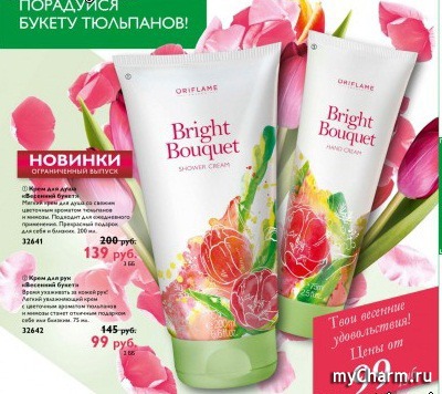Читаешь, любуешься и поддаёшься радостному чувству, что - вот ОНО, то самое... Заказываешь и нетерпеливо ждёшь. Впрочем, что уж тут говорит, ждёшь обычно недолго и встреча со своей яркой радостью наступает в достаточно короткий срок. Что мы заказали на сей раз? Набор Bright Bouquet, состоящий из крема для рук и крема для душа с ароматами тюльпанов и мимозы в одном букете, то бишь - флаконе. Ну как не порадовать себя? О креме для рук я уже писала, сегодня речь о креме для душа.