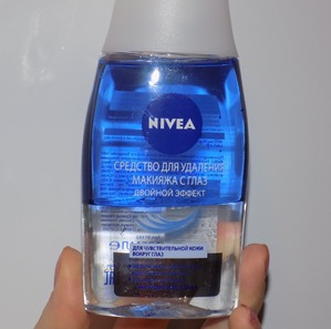 Большая часть приобретенных мною продуктов мне не подходила, во время использования и после него появлялось жжение и краснота. Неприятно, неправда ли? В очередной раз я не стала испытывать судьбу, и прежде чем сделать покупку, я перечитала кучу информации о существующих средствах для снятия макияжа с глаз популярных и не очень марок. В итоге мой выбор пал на двухфазное средство для удаления макияжа «Двойной эффект» от Nivea. Кстати, этот продукт я приобретала вкупе с освежающим муссом для умывания «Aqua Effect».