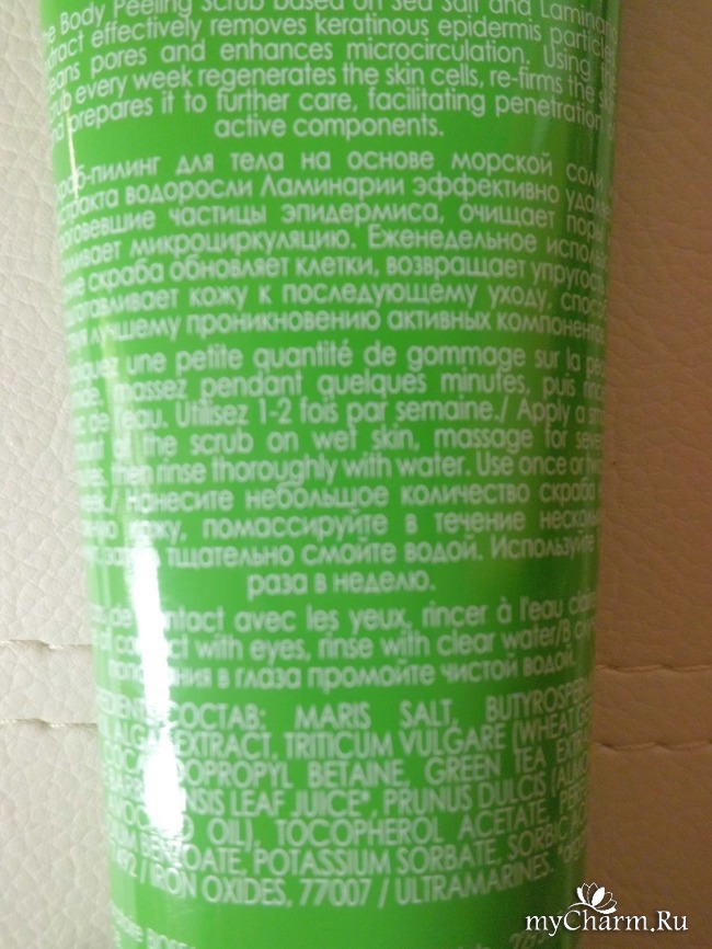 На обратной стороне, как обычно, расписаны свойства средства и состав, указан адрес производителя. Нам обещают нежное очищение кожи и обновление клеток при регулярном применении благодаря морской соли и экстракту водоросли Ламинарии.
