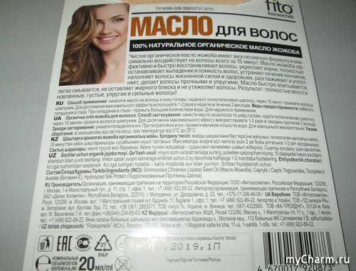 Производитель, судя по написанному на упаковке, обещает, что масло легко смывается, останавливает выпадение, ломкость и сечение волос, уплотняет и укрепляет их.