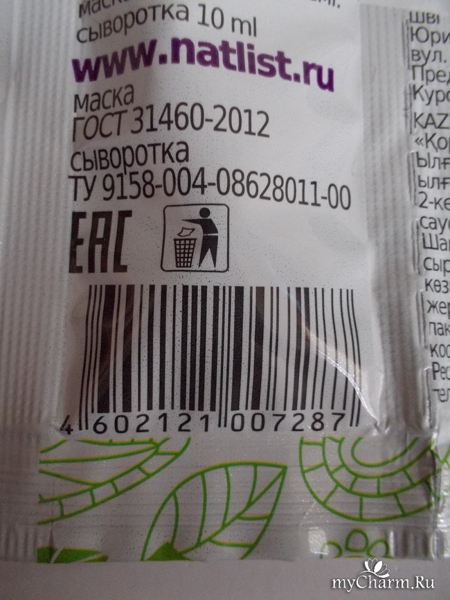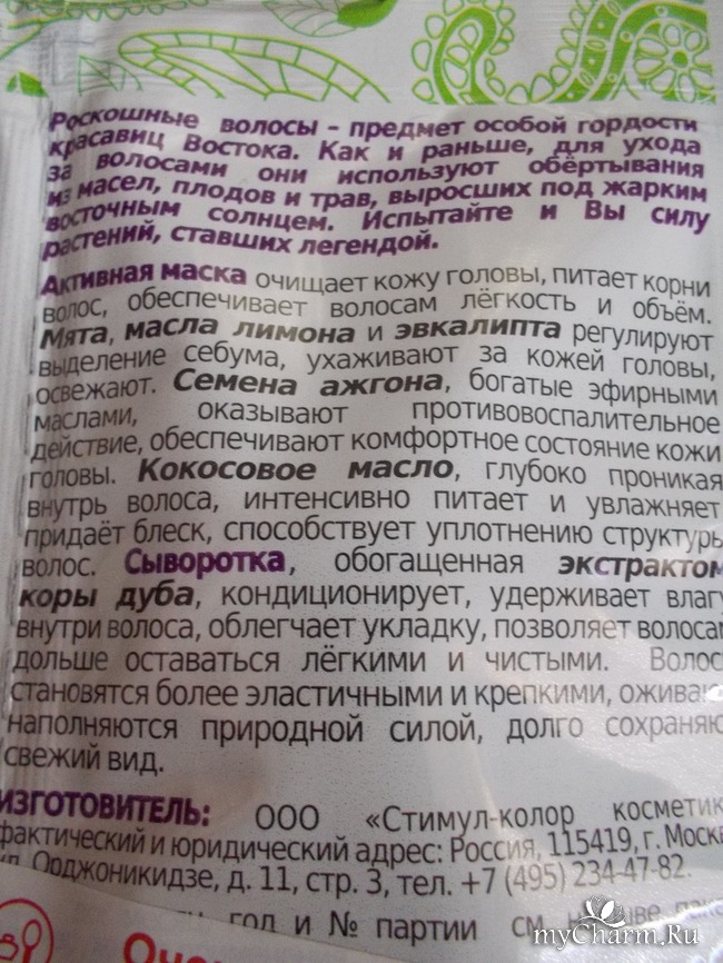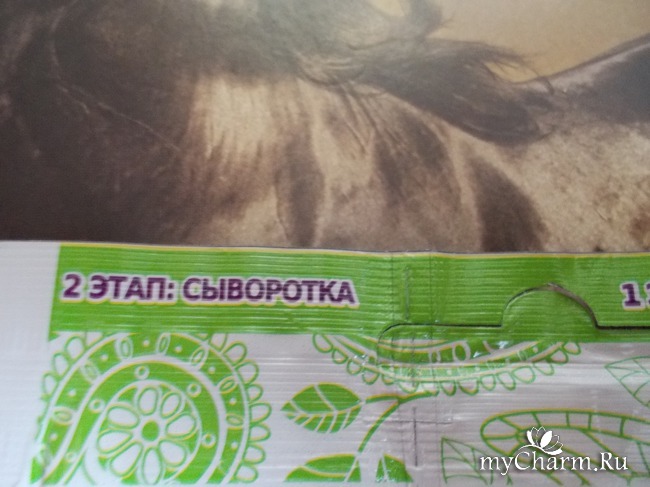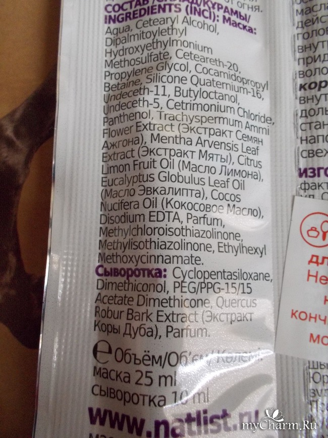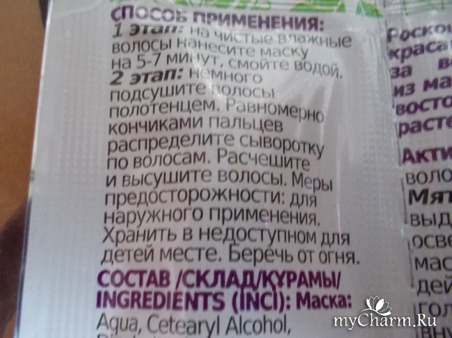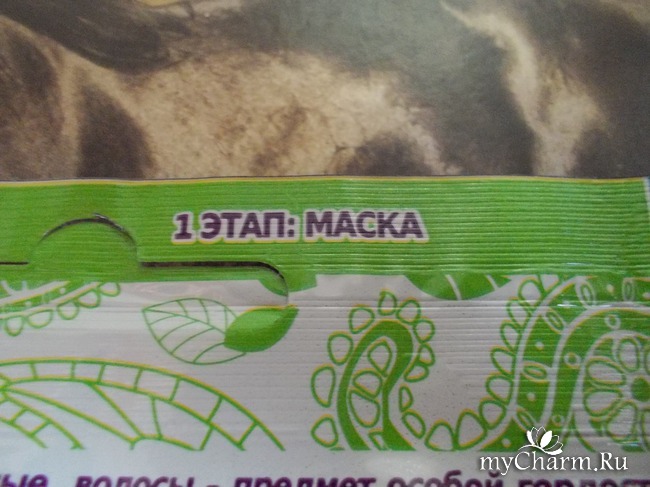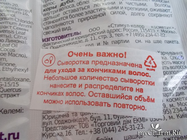 Пакетик разделён на два отсека, которые легко можно оторвать друг от друга. В широком отсеке находится маска, в узеньком отсеке находится увлажняющая сыворотка. На задней поверхности упаковки приклеена наклейка с предупреждением, что сыворотка наносится только на кончики волос, а не по всей длине. Потому что, если нанести на всю длину волос, эффект получится обратный: волосы будут липкими и свалявшимися, как сальные, грязные волосы.