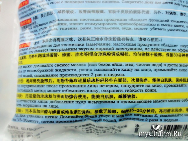 Пакетик довольно приличных размеров 250 грамм стоимостью около 300 рублей удобно закрывается ЗИП застежкой, не допуская попадания влаги. На обложке пакетика изображены фото китайской девушки с безупречным белоснежным лицом и раковины с отборными жемчужинами.
