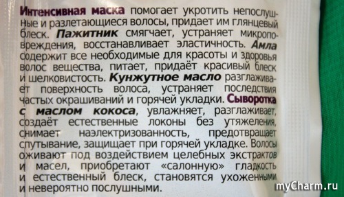 Маску следует наносить на чистые влажны волосы, распределить по всей длине и оставить действовать на 5-7 минут. Затем смываем и сушим волосы полотенцем. Действие заметно после первого применения: волосы увлажненные, мягкие и гладкие, легко расчесываются и поддаются укладке. Могу сравнить эффект маски с хорошим бальзамом-кондиционером, однако, то, что не видно на первый взгляд, кроется в составе. Не стоит торопиться с выводами, ведь действие маски основано и на растительных компонентах.